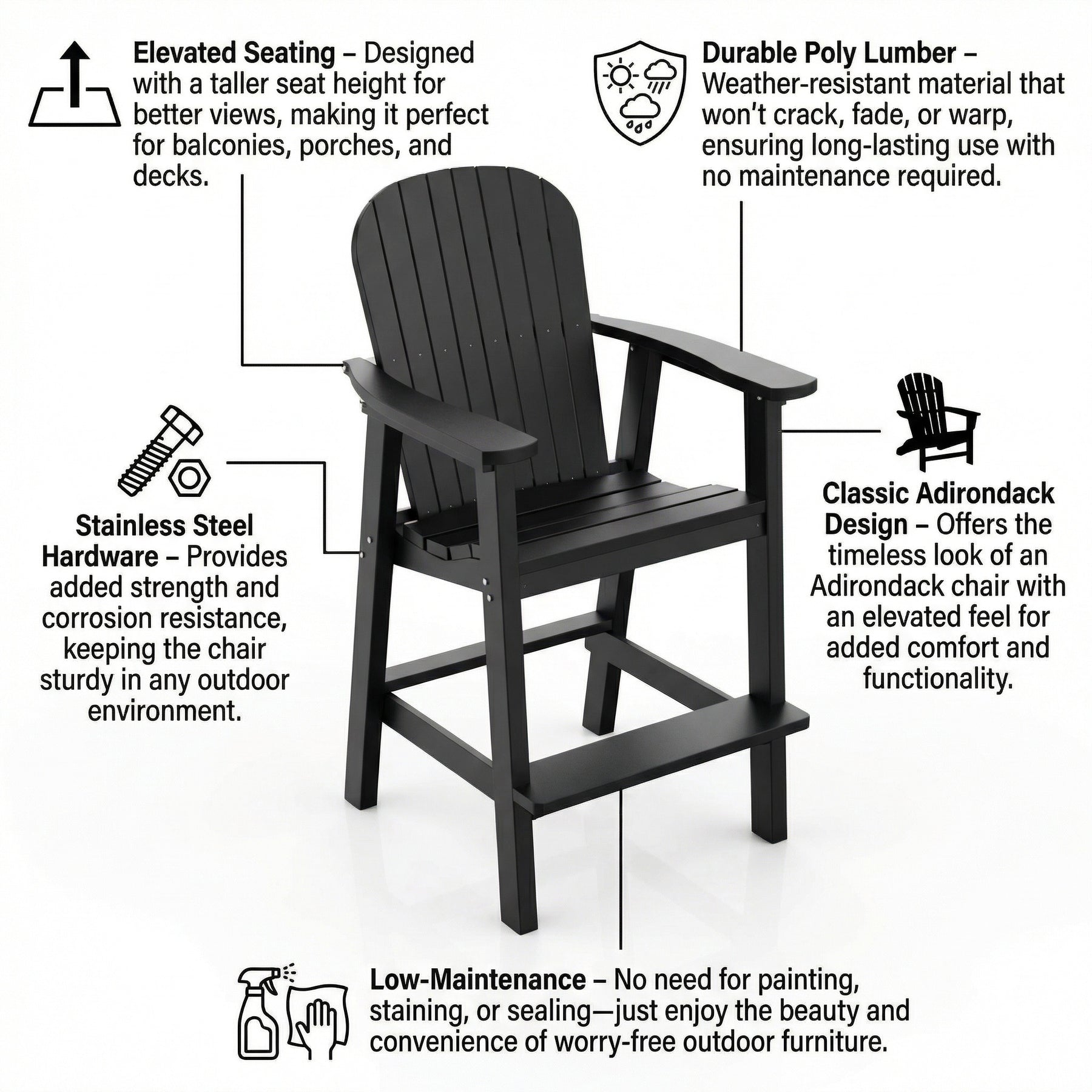 Balcony Height Poly Adirondack Chair. Designed for overlooking railing or just for an elevated view.