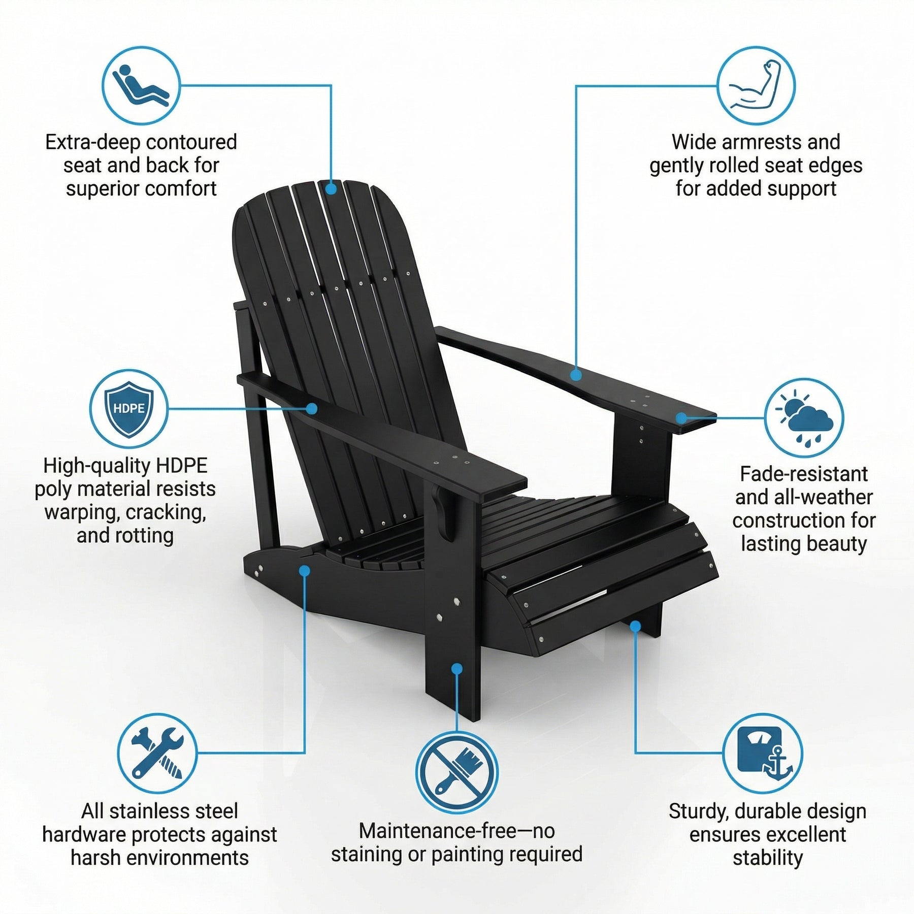 - The Classic Poly Adirondack Chair is our most comfortable design. It features a contoured seat and back. The poly classic chair offers wide armrests and a seat that rolls under your legs to give added comfort. Very sturdy and durable construction gives plenty of stability. Made from high quality HDPE poly material. All stainless steel hardware protects against harsh environments. All weather and maintenance free! Looks and feels like wood, but lasts decades longer. No up keep like staining or painting that wooden Adirondack chairs require. Poly Adirondack chairs look brand new season after season.